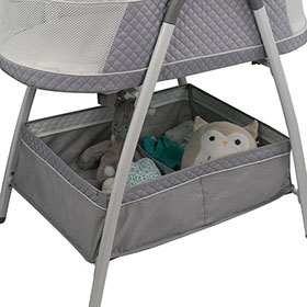 Whether in use as a portable bed or bassinet, the multi-use Journey spares no detail when it comes to style for your home. The traditional shape is enhanced by quilted premium fabrics, engaging sounds and vibration and sleek storage to keep your space tidy.
